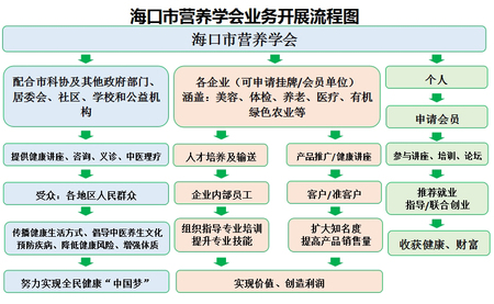 海口市营养学会是在海口市委、市政府支持下,经海口市民政局核准,在海口市科学技术协会的领导下,于2012年12月26日注册成立的非营利性专业学术社团机构。 海口市营养学会的宗旨:执行党和国家的政策方针,以提高广大公民的身心健康为已任,传播营养健康知识,倡导健康的生活方式,引导和改变公民不良的生活习惯,远离疾病,享受健康生活。 海口市营养学会的主要职能:发挥专业机构特长,传播健康知识、培训专业健康养生人才,提高公民的健康意识,配合相关部门进行膳食调查和咨询,营养评价及宣教等,举办各类营养与健康咨询等公益活动,举办专业学术论坛。 海口市营养学会由专业的医学教授专家、国家级公共营养师、国家级健康管理师、国家级保健按摩师、中医康复理疗师、营养工作者、养生爱好者等发起而成立的。企业法人、秘书长、名誉会长、理事长、理事和常务理事由医学教授和资深营养师担任,会员由医生、护士、营养师、心理咨询师、理疗师、养生爱好者、热心公益事业的社会名流及企事业家组成。 从创办至今,海口市营养学会多次组织和参与各种健康科普活动,如:“送健康进社区”、“送健康进校园”、“送健康进农场”等,累计超过500场。受广大人民群众一致好评。 海口市营养学会业务开展流程
